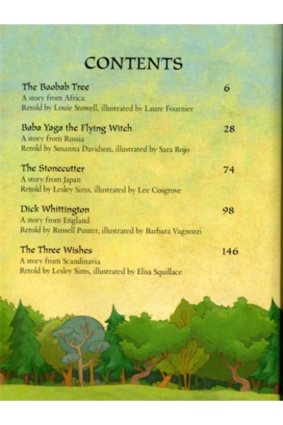 Description : A wonderful collection of ten folktales specially chosen from around the World. Stories are The Baobab Tree, Baba Yaga the Flying Witch, The Stonecutter, Dick Whittington, The Three Wishes, The Fish that Talked, King Midas and the Golden Touch, Brer Rabbit Down the Well, The Magic Pear Tree and Genie in the Bottle. Each story is brilliantly illustrated by artists from the Usborne Young Reading Programme.