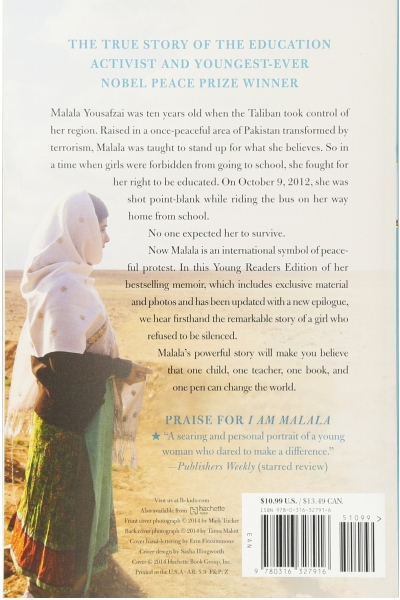 Description : The bestselling memoir by Nobel Peace Prize winner Malala Yousafzai. I Am Malala. This is my story. Malala Yousafzai was only ten years old when the Taliban took control of her region. They said music was a crime. They said women weren't allowed to go to the market. They said girls couldn't go to school. Raised in a once-peaceful area of Pakistan transformed by terrorism, Malala was taught to stand up for what she believes. So she fought for her right to be educated. And on October 9, 2012, she nearly lost her life for the cause: She was shot point-blank while riding the bus on her way home from school. No one expected her to survive. Now Malala is an international symbol of peaceful protest and the youngest ever Nobel Peace Prize winner. In this Young Readers Edition of her bestselling memoir, which has been reimagined specifically for a younger audience and includes exclusive photos and material, we hear firsthand the remarkable story of a girl who knew from a young age that she wanted to change the world -- and did. Malala™spowerful story will open your eyes to another world and will make you believe in hope, truth, miracles and the possibility that one person -- one young person -- can inspire change in her community and beyond.