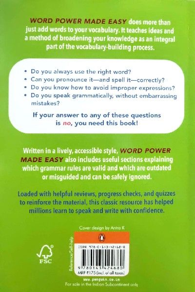 Description : A core book about English language and correct word usage; those who are preparing for CAT, GMAT, GRE, TOEFL and other such examinations would definitely stand to greatly benefit from this book. Anybody who wants to improve one™svocabulary will also find it very useful. Authored by Norman Lewis, the grammarian from New York who has several other English language books to his credit, 'Word Power Made Easy' became popular soon after the first edition was released in the year 2009. For those Indian students who have to clear the Test of English as a Foreign Language (TOEFL), an essential examination for securing admission to many overseas universities, improving vocabulary and knowing about the correct usage of similarly spelled words or pronounced words is most essential. The book is broadly divided into three sections. By way of simple techniques, the author has presented easy tips for improving one™svocabulary and word skills. After having created awareness about the new words and their meaning, he then goes on to explain how to make their correct usage. Norman Lewis, by way of citing several examples, even explains the correct usage of many words that often have the user confused. The diction and many idioms are explained in detail. Picking up the correct synonym, when arriving at a particular expression, has also been explained. A section of the book even explains many etymology concepts that one can easily adopt for getting a better grasp of the language. The book has been divided into oriented sessions that need action from the user and there are many exercises that challenge and enhance one™slanguage skills. At the end of every chapter ends there is a review exercise. Putting oneself to test for these review exercises will give the user a progressive check about the grasp of the language one is gaining. At many places, the monotony of the chapters has been splintered with trivia that keeps the reader™sinterest in the subject alive and even encourages one to keep practicing more. The book is laid out in an easy to understand language but at places does challenge ones comprehension of the subject. Since 2009, when this 686 page book was first released, it has only become more popular as the years have gone by. Not just students who are seeking admission to prestigious foreign universities, this book also has many takers who are working to improve their vocabulary and general hold over the English language.