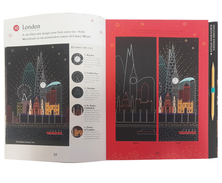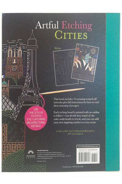Description : Etch away the lines on the page to reveal stunning and colourful cityscapes. Explore the beauty of urban landscape with Artful Etching, Cities. Etch the ten cityscapes in the book using the included tool to reveal colourful details and beautiful buildings. All the etching pages have outlines to follow and it’s up to you to decide how much detail to reveal! An introductory section describes how to etch the scenes for the best results and examples of finished pieces are included for reference.