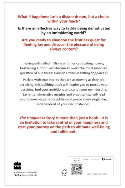 Description : What if happiness isn't a distant dream, but a choice within your reach? Is there an effective way to tackle being demotivated by an intimidating world? Are you ready to abandon the fruitless quest for fleeting joy and discover the pleasure of being always content? Having enthralled millions with her captivating novels, bestselling author Savi Sharma answers the most searched question of our times: How do I achieve lasting happiness? Packed with true stories that are as moving as they are enriching, this uplifting book will inspire you to pursue your passions, fuel your ambitions and script your own destiny. Savi™stransformative insights and practical tips will lead you towards experiencing bliss and peace every single day, independent of your circumstances. The Happiness Story is more than just a book-it is an invitation to take control of your happiness and start your journey on the path to ultimate well-being and fulfilment.