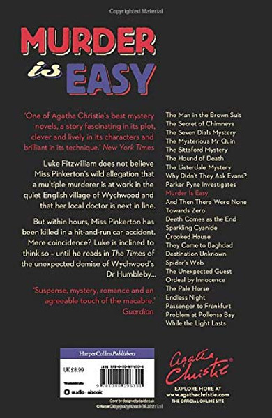Description : Agatha Christie™singenious murder mystery thriller, reissued with a striking new cover designed to appeal to the latest generation of Agatha Christie fans and book lovers. Luke Fitzwilliam could not believe Miss Pinkerton™swild allegation that a multiple murderer was at work in the quiet English village of Wychwood - or her speculation that the local doctor was next in line. But within hours, Miss Pinkerton had been killed in a hit-and-run car accident. Mere coincidence? Luke was inclined to think so - until he read in The Times of the unexpected demise of Dr Humbleby...