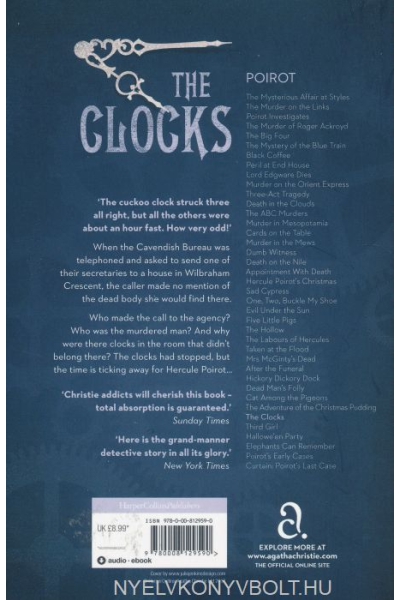 Description : A typist uncovers a man’s body from behind the sofa… As instructed, stenographer Sheila Webb let herself into the house at 19 Wilbraham Crescent. It was then that she made a grisly discovery: the body of a dead man sprawled across the living room floor. What intrigued Poirot about the case was the time factor. Although in a state of shock, Sheila clearly remembered having heard a cuckoo clock strike three o’clock. Yet, the four other clocks in the living room all showed the time as 4.13. Even more strangely, only one of these clocks belonged to the owner of the house…