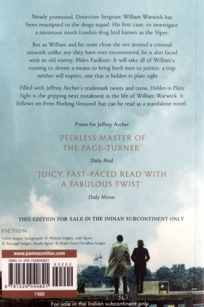 Description : Hidden in Plain Sight is the second brilliant and captivating novel featuring William Warwick by the master storyteller and bestselling author of the Clifton Chronicles, Jeffrey Archer. Newly promoted, Detective Sergeant William Warwick has been reassigned to the drugs squad. His first case: to investigate a notorious south London drug lord known as the Viper. But as William and his team close the net around a criminal network unlike any they have ever encountered, he is also faced with an old enemy, Miles Faulkner. It will take all of William’s cunning to devise a means to bring both men to justice; a trap neither will expect, one that is hidden in plain sight . . . Filled with Jeffrey Archer’s trademark twists and turns, Hidden in Plain Sight is the gripping next instalment in the life of William Warwick. It follows on from Nothing Ventured, but can be read as a standalone story.