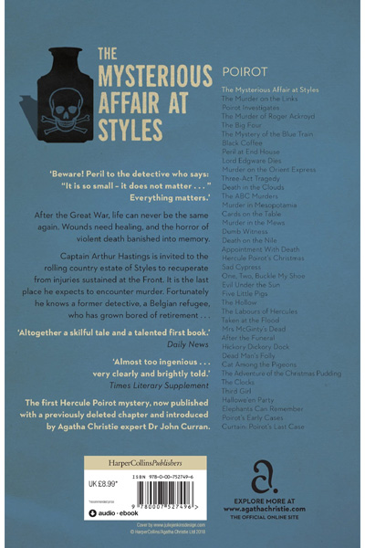 Description : Agatha Christie™sfirst ever murder mystery, reissued with a striking new cover - includes for the first time the original courtroom climax as an alternate ending. 'Beware! Peril to the detective who says: It is so small - it does not matter... Everything matters.' After the Great War, life can never be the same again. Wounds need healing, and the horror of violent death banished into memory. Captain Arthur Hastings is invited to the rolling country estate of Styles to recuperate from injuries sustained at the Front. It is the last place he expects to encounter murder. Fortunately he knows a former detective, a Belgian refugee, who has grown bored of retirement ... The first Hercule Poirot mystery, now published with a previously deleted chapter and introduced by Agatha Christie expert Dr John Curran.