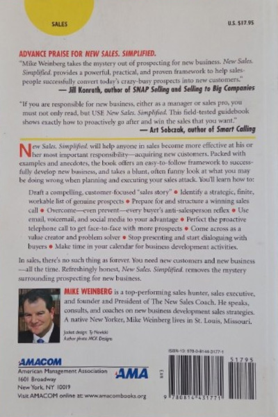 Description : No matter how much repeat business you get from loyal customers, the lifeblood of your business is a constant flow of new accounts. Whether you're a sales rep, sales manager or a professional services executive, if you are expected to bring in new business, you need a proven formula for prospecting, developing and closing deals. New Sales. Simplified. is the answer. You'll learn how to Identify a strategic, finite, workable list of genuine prospects, draft a compelling, customer-focused sales story, perfect the proactive telephone call to get face-to-face with more prospects, use email, voicemail, and social media to your advantage, overcome, even prevent every buyer™santi-salesperson reflex, build rapport, because people buy from people they like and trust. Prepare for and structure a winning sales call, stop presenting and start dialoguing with buyers. Make time in your calendar for business development activities and much more. Packed with examples and anecdotes, New Sales. Simplified balances a blunt (and often funny) look at what most salespeople and executives do wrong with an easy-to-follow plan for ramping up new business starting today.