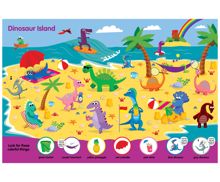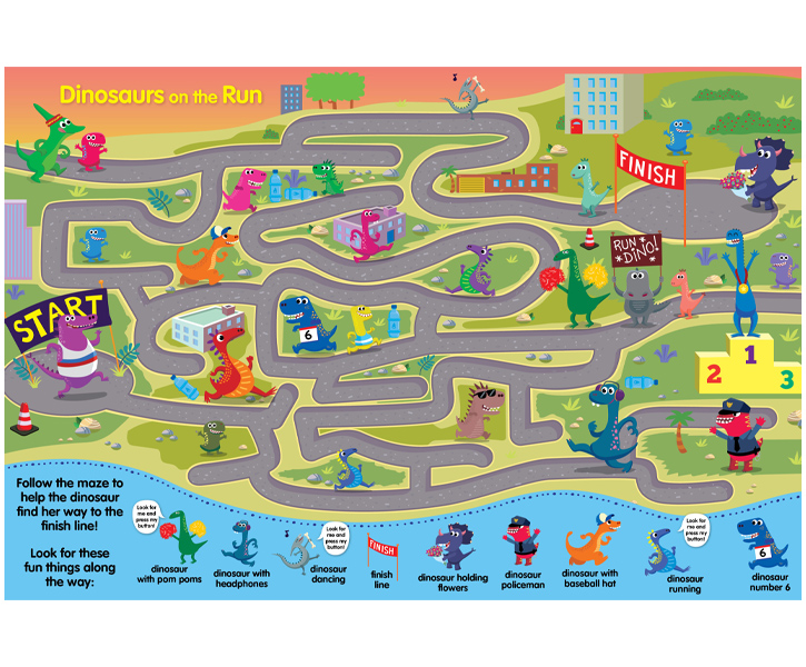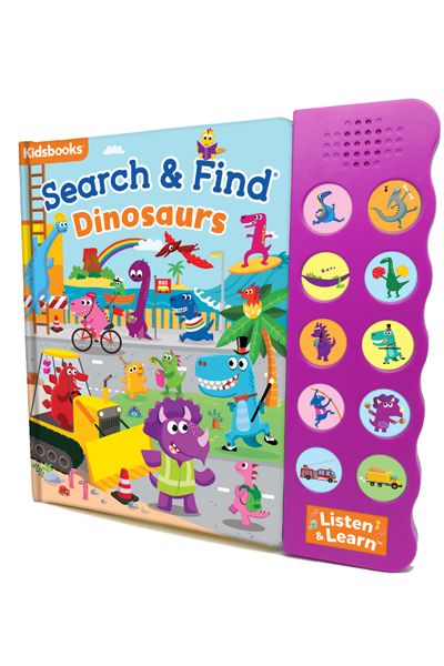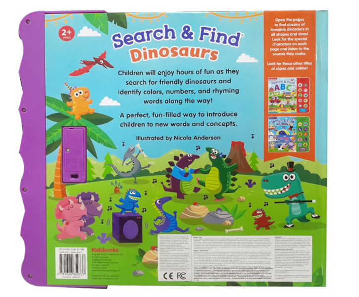 Description : Children will enjoy hours of fun as they search for friendly dinosaurs and identify colours, numbers, and rhyming words along the way! Plus, little ones will love looking for the special characters on each page and hearing the sounds they make! This Search and Find series promotes word, picture, number, and sound recognition with 10 fun-to-press buttons!