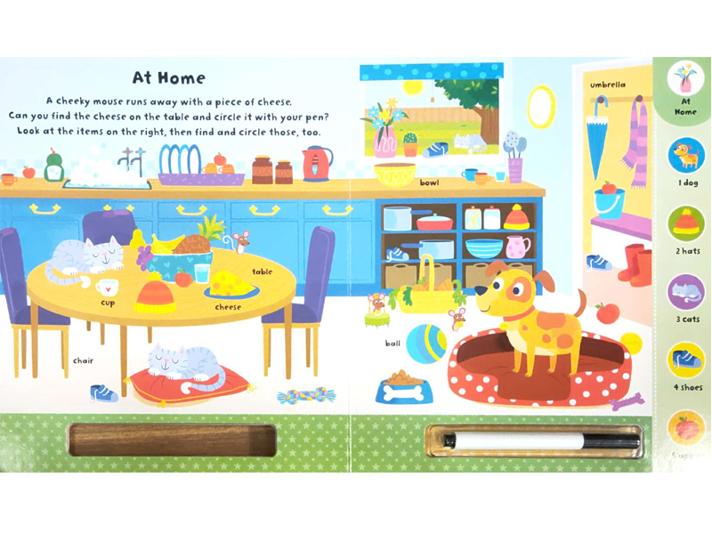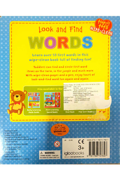 Description : Learn over 50 first words in this wipe-clean book full of finding fun! Toddlers can find and circle first word items on the farm, in the jungle and much more. With wipe-clean pages and a pen, enjoy hours of look-and-find word fun again and again.