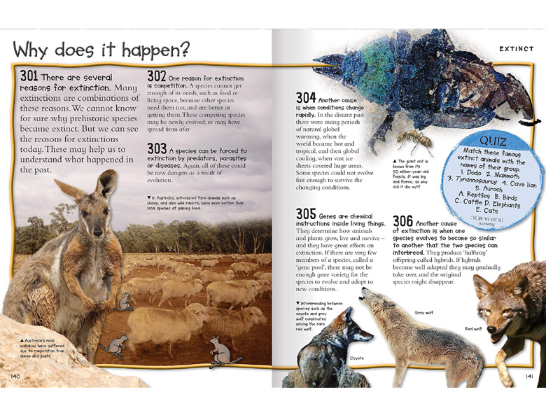 Description : Lavishly illustrated throughout, this title provides children with masses of knowledge about the animal kingdom. The numbering system acts as a benchmark, and as children read they can clearly chart their progress through a world of incredible animals, from deadly prehistoric monsters to species threatened with extinction today. Cartoons, quizzes, fun facts and projects are scattered throughout to actively encourage reading and learning.