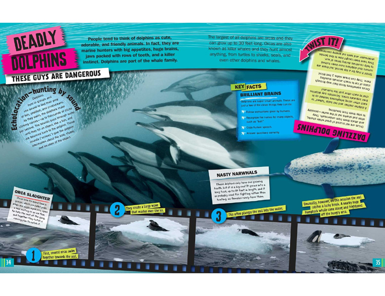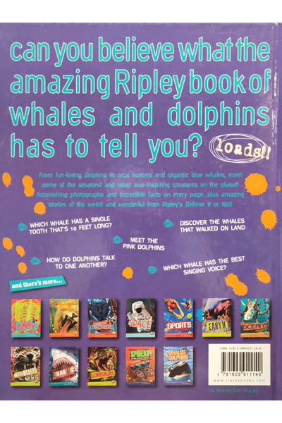 Description : Ripley™sBelieve It or Not is excited to present a brand new title in this award-winning series. Whales and Dolphins explores the oceans and gives a new twist on these facinating creatures. From the Antarctic to the sunny coasts of the Caribbean, you can get a glimpse into the mysterious lives of these sea mammals. With tons of amazing images, wacky facts and unbelievable stories, kids will love reading about all of these creatures, from the friendly bottlenose dolphin, to the intimidating killer whale!