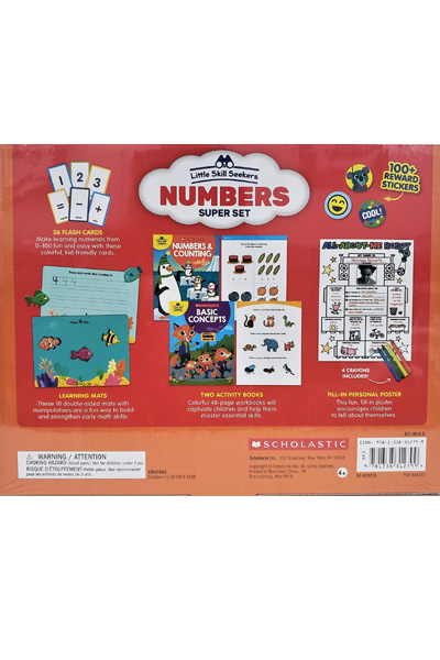 Description : This workbook set includes: 10 Double-Sided Learning Mats - a fun way to build and strengthen early math skills, Two 48-page Activity Books that will captivate children and help them master essential skills, 56 Flash Cards that make learning numerals from 0-100 fun, and a Giant Write-In Poster + 4 Crayons that encourages children to tell about themselves.