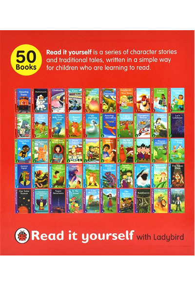 Description : This amazing 50-book collection isn't just incredible value, it is sure to offer your child an array of stories perfectly suited to their developing reading level and, in turn, help them grow into avid young bookworms too! With familiar fairy tale storylines like the Ugly Ducking and Cinderella, as well as popular characters including Peppa Pig, Moshi Monsters and Peter Rabbit featured throughout, the engaging text and full-colour illustrations in the books will support children as they become fluent, independent and confident readers. With fun puzzles and questions to gently test children, this comprehensive collection covers the Ladybird Read It Yourself Levels 1, 2, 3 and 4 and can be enjoyed by children aged from 4 right the way up to 7 years old. Titles in this set: Level 1: The Ugly Duckling, The Bravest Fox, The Three Billy Goats Gruff, Jon™sFootball Team, Rex The Big Dinosaur, Favourite Pets, I am a Doctor, Little Red Hen, Goldilocks and The Three Bears, Dinosaurs, The Enormous Turnip, Cars, Cinderella, Astronauts, Amazing Trains. Level 2: The Princess and The Frog, The Monster Next Door, The Three Little Pigs, Sly Fox and Red Hen, Sleeping Beauty, Rumpelstiltskin, Pirate School, Little Red Riding Hood, The Gingerbread Man, Superhero Max, Let™sCelebrate, Beauty and The Beast, Emergency Rescue, I am a Footballer, Amazing Aircraft. Level 3: The Talent Show, Jack and The Beanstalk, Sharks, Hansel and Gretel, Reptiles and Amphibians, Puss in Boots, Aladdin, The Jungle Book, Minibeasts, Ancient Egypt. Level 4: Peter and The Wolf, The Wizard of Oz, Rainforests, The Mystery Drone, Heidi, The Little Mermaid, In The Ocean, Super Structures, Ancient and Imperial China, Our Solar System. Description: Level 1: For children who are ready to take their first steps in reading Level 2: For beginner readers who can read short, simple sentences with help Level 3: For more confident readers who can read simple stories with some help Level 4: Longer stories for more independent fluent readers