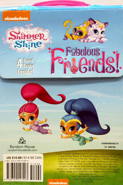 Description : A boxed set of board books starring Shimmer and Shine! Boys and girls ages 0 to 3 who like Nickelodeon™smagical genies-in-training will love this sturdy box featuring four board books and a plastic handle for magical adventures on the go! Boom Zahramay! Shimmer and Shine is Nickelodeon™smagical animated children™sprogram featuring the madcap adventures of genies-in-training Shimmer and Shine. These two twins grant wishes for their best human friend Leah and show preschoolers that things are always better when you work together.