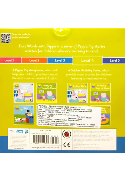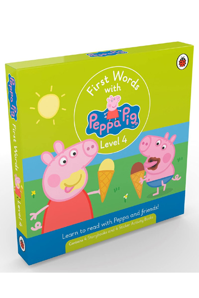 Description : Learn to read with Peppa and friends! First Words with Peppa is a levelled reading series of Peppa Pig stories for children who are learning to read. The series is based on the Dolch Sight Words list; a list of the 220 most common words found in children™sEnglish-language reading material. The five levels of First Words with Peppa are suitable for children aged 4-6, or younger if supported by an adult. This Level 4 Box Set includes four Storybooks and four Sticker Activity Books. With helpful reading tips for parents, games to encourage repetition, and audio available for all of the stories, First Words with Peppa is a fun way for children to learn to read. Each Storybook features a story from the well-loved Peppa Pig TV episodes, retold to introduce around ten Sight Words. These words are repeated regularly throughout the story. It is through this repetition that children become familiar with the words and begin to recognise them. Any words in the story that aren't Sight Words, character names or important nouns, are phonically decodable so that children can use their phonics knowledge to read these extra words. Included in this box: The four stories in First Words with Peppa Level 4 are: 1) Bedtime Story 2) Daddy Pig Loses His Glasses 3) Dens 4) The Very Hot Day They introduce the following Sight Words: always, around, because, been, before, best, both, buy, call, cold, does, don't, fast, first, five, found, gave, goes, green, its, made, many, off, or, pull, read, right, sing, sit, sleep, tell, their, these, those, upon, us, use, very, wash, which, why, wish, work, would, write, and your.