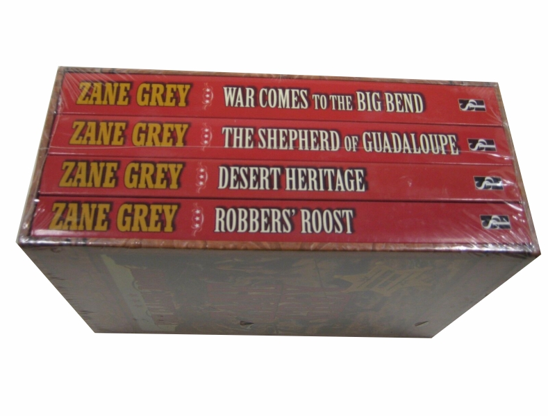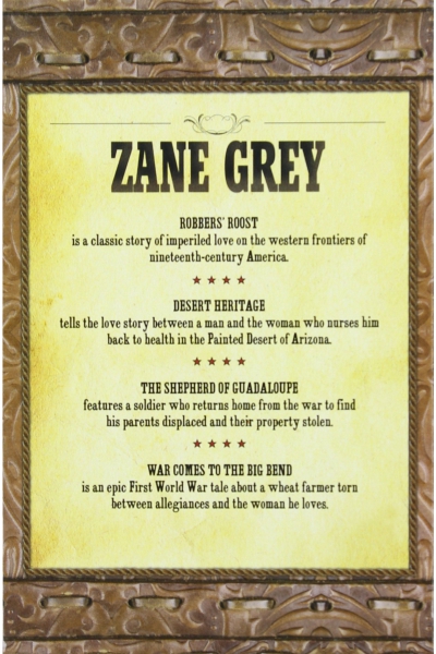 Description : Zane Grey, the bestselling author of sixty-five Western novels, is one of the most recognized and respected writers of Western fiction. His works have been translated into twenty-three languages and have been made into more than one hundred movies. This box set includes four Zane Grey classics in paperback at a great value price: - Robbers' Roost - Desert Heritage - Shepherd of Guadaloupe - War Comes to the Big Bend