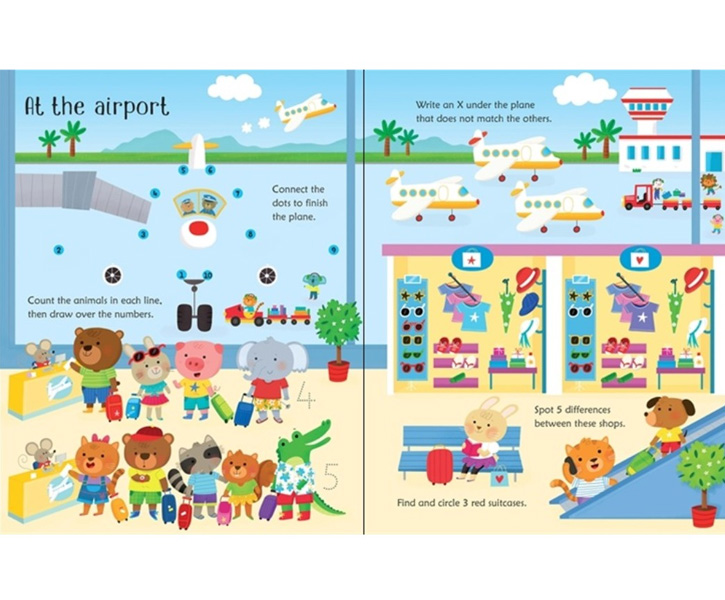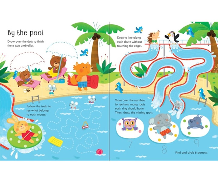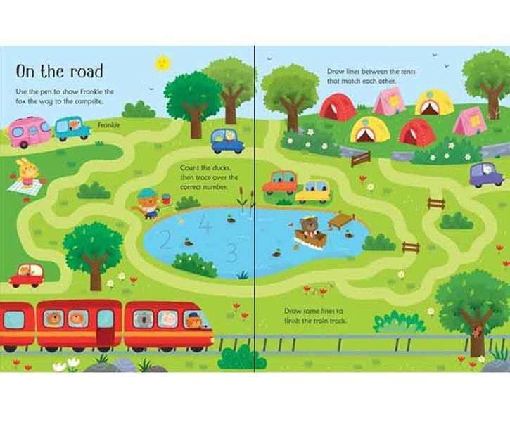 Description : Visit the beach, go on a camping trip, relax by the pool and zoom down ski slopes in this entertaining activity book. The activities are designed to help young children develop their counting, observation and pen control skills, and the durable pages can be wiped clean, so the book can be enjoyed again and again.