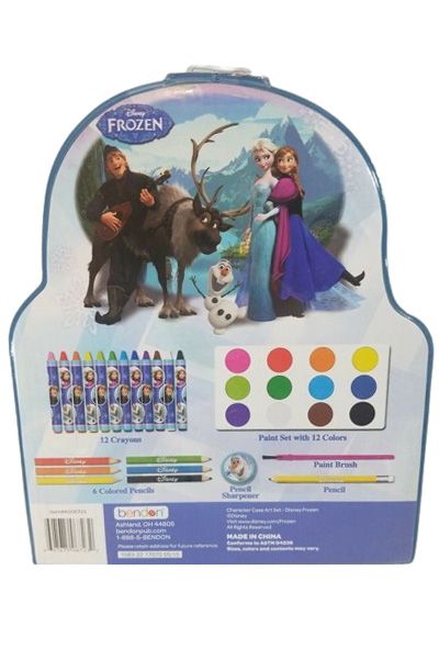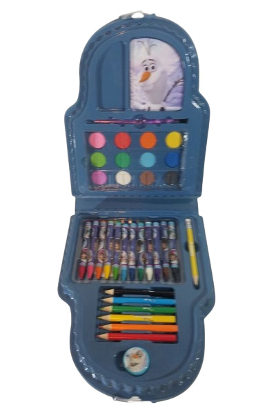 Description : A perfect for our little artist. It™sa small art case featuring your favourite Disney Frozen character Olaf. The set includes : - 12 crayons - paint set with 12 watercolours - 6 colour pencils - 1 pencil sharpener - 1 paint brush - 1 pencil. All of this will be in a nicely portable case, so your little one™swill be happy to have one...