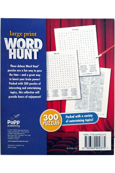 Description : These deluxe Word Hunt puzzles are a fun way to pass the time-and a great way to boost your brain power! Packed with 300 puzzles of interesting and entertaining topics, this collection will provide hours of enjoyment!