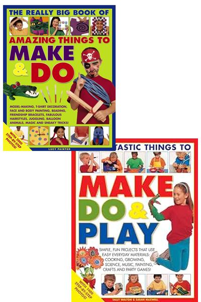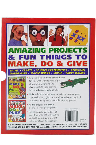 Description : Two fantastic books in a box. The ultimate rainy-day collection with 220 exciting step-by-step projects. These books are packed full of exciting ideas and activities for children --paint, crafts, Science experiments, cooking, gardening, magic tricks, music and party games. Make a feather head-dress, wooden spoon Puppets and a printed t-shirt; conduct simple experiments about light, sound and Water; learn magic tricks and juggling; play fabulous party games; and do creative face painting --all the projects use easy, safe materials and equipment you will find around the home, and all the techniques are clearly explained with step-by-step photographs and lively finished pictures to inspire and delight.