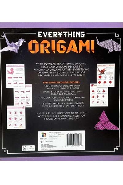 Description : Instructions for 55 Beautiful Models - Traditional, Decorative, Flowers, Toys, Boxes, Animals, & Geometric. 24 Origami Sheets included. With popular traditional origami pieces and origami designs by renowned origami artists. Everything Origami is the ultimate guide for beginners and enthusiasts alike! Includes: - This complete guide - Six sections of origami with over 55 stunning designs - Simple step-by-step instructions and clear diagrams - Information on folding techniques and paper types - 12 sheets of origami paper divided into 24 squares of different sizes