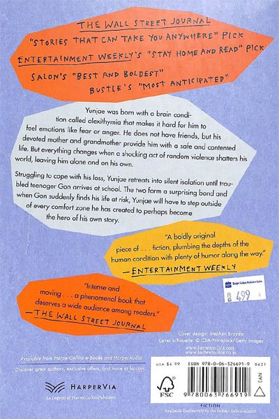 Description : The Emissary meets The Curious Incident of the Dog in the Nighttime in this poignant and triumphant story about how love, friendship, and persistence can change a life forever. This story is, in short, about a monster meeting another monster. One of the monsters is me. Yunjae was born with a brain condition called Alexithymia that makes it hard for him to feel emotions like fear or anger. He does not have friends, the two almond-shaped neurons located deep in his brain have seen to that, but his devoted mother and grandmother provide him with a safe and content life. Their little home above his mother’s used bookstore is decorated with colourful Post-it notes that remind him when to smile, when to say “thank you,†and when to laugh. Then on Christmas Eve, Yunjae’s sixteenth birthday, everything changes. A shocking act of random violence shatters his world, leaving him alone and on his own. Struggling to cope with his loss, Yunjae retreats into silent isolation, until troubled teenager Gon arrives at his school, and they develop a surprising bond. As Yunjae begins to open his life to new people including a girl at school something slowly changes inside him. And when Gon suddenly finds his life at risk, Yunjae will have the chance to step outside of every comfort zone he has created to perhaps become the hero he never thought he would be.