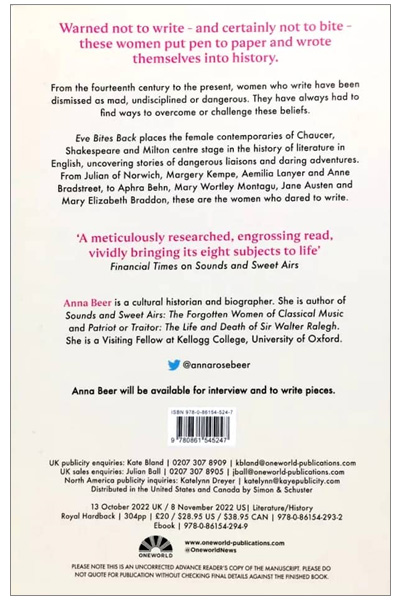 Description : Anna Beer investigates the lives and achievements of eight women writers, uncovering a startling and unconventional history of literature. Margery Kempe. Aemilia Lanyer. Aphra Behn. Lady Mary. Jane Austen. Warned not to write and certainly not to bite these women put pen to paper anyway and wrote themselves into history. ‘Smart, funny and highly readable... a tour de force.’ -- A.L. Kennedy Ever since Sappho first put stylus to papyrus, women who write have been labelled mad, undisciplined and dangerous. Funny and provocative, Eve Bites Back offers an alternative history of English literature. Placing the female contemporaries of Chaucer, Shakespeare and Milton centre stage, Anna Beer builds a vibrant new canon through Restoration wits, scandalous sensation novelists and medieval mystics. Delving into the lives and work of eight pioneers – Julian of Norwich, Margery Kempe, Aemilia Lanyer, Anne Bradstreet, Aphra Behn, Mary Wortley Montagu, Jane Austen and Mary Elizabeth Braddon – Beer uncovers the struggles and triumphs of these game changers, ground-breakers and genre-makers.