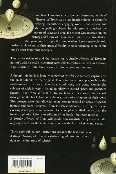 Description : Stephen Hawking™sworldwide bestseller, A Brief History of Time, has been a landmark volume in scientific writing. Its author™sengaging voice is one reason, and the compelling subjects he addresses is another: the nature of space and time, the role of God in creation, the history and future of the universe. But it is also true that in the years since its publication, readers have repeatedly told Professor Hawking of their great difficulty in understanding some of the book™smost important concepts. This is the origin of and the reason for A Briefer History of Time, its author™swish to make its content accessible to readers as well as to bring it up-to-date with the latest scientific observations and findings. Although this book is literally somewhat 'briefer', it actually expands on the great subjects of the original. Purely technical concepts, such as the mathematics of chaotic boundary conditions, are gone. Conversely, subjects of wide interest that were difficult to follow because they were interspersed throughout the book have now been given entire chapters of their own, including relativity, curved space, and quantum theory. This reorganization has allowed the authors to expand areas of special interest and recent progress, from the latest developments in string theory to exciting developments in the search for a complete, unified theory of all the forces of physics. Like prior editions of the book-but even more so - A Briefer History of Time will guide non-scientists everywhere in the ongoing search for the tantalizing secrets at the heart of time and space. Thirty-eight full-colour illustrations enhance the text and make A Briefer History of Time an exhilarating addition in its own right to the literature of science.
