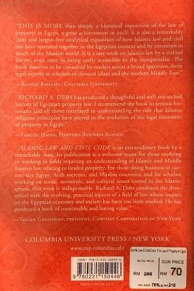 Description : Richard A. Debs analyzes the classical Islamic law of property based on the Shari'ah, traces its historic development in Egypt, and describes its integration as a source of law within the modern format of a civil code. He focuses specifically on Egypt, a country in the Islamic world that drew upon its society™sown vigorous legal system as it formed its modern laws. He also touches on issues that are common to all such societies that have adopted, either by choice or by necessity, Western legal systems. Egypt™sunique synthesis of Western and traditional elements is the outcome of an effort to respond to national goals and requirements. Its traditional law, the Shari'ah, is the fundamental law of all Islamic societies, and Debs™sanalysis of Egypt™sexperience demonstrates how Islamic jurisprudence can be sophisticated, coherent, rational, and effective, developed over centuries to serve the needs of societies that flourished under the rule of law.