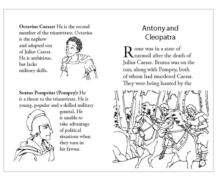 Description : Antony and Cleopatra is a brilliant drama of love and war by William Shakespeare. Hailed as one of the master playwright s greatest tragedies, the play is set in ancient Rome and Egypt, and portrays actual events from Roman history. It revolves around its two main characters, Antony, a Roman General, and Cleopatra, the Queen of Egypt. Antony falls in love with Cleopatra, and throughout the play remains torn between his duty and his love for her. This short narrative version of the play has been suitably adapted to help introduce the play to young readers. It can be read by children or read to them by parents who wish to introduce them to the play. It can also be used by teachers as a classroom resource. The easy-to-read narration and comic-style illustrations are sure to captivate childrens interest and develop their reading skills.