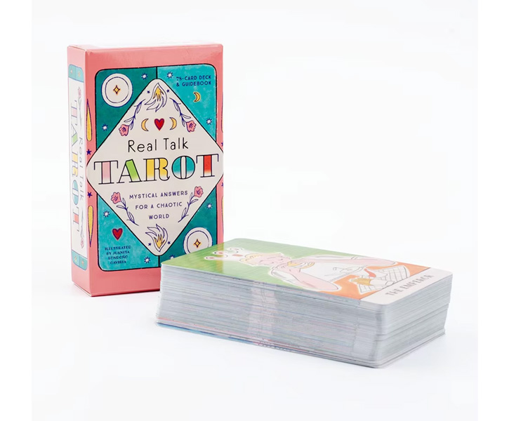 Description : The tarot deck for our day, Real Talk Tarot complete with a guidebook and keepsake box—speaks to our present-day icons and struggles with updated illustrations featuring relatable archetypes and scenes. Let’s be real; modern life can feel surreal and disorienting sometimes. This tarot deck, updated from the classic Rider Waite version, is perfect for everyone from novice to expert who is looking for guidance in today’s world, which often feels like it’s on fire. Each of the 78 cards is connected to today’s world by characters and situations you might encounter any day. Some of the illustrations are lighthearted, like the King of Cups depicted as a handsome barista, and some are less so, such as the Seven of Wands represented by a heated political protest in the streets, but each card is true to the experience of life today while staying true to its original tarot meaning. The beautifully illustrated, highly giftable deck comes with a 64-page interpretation guidebook so beginners and experts alike can read the cards. The deck and book come in a beautiful keepsake box. Whether you are looking to add a unique deck to your collection or are just beginning your tarot journey, Real Talk Tarot is the fresh take on tarot that you need right now.