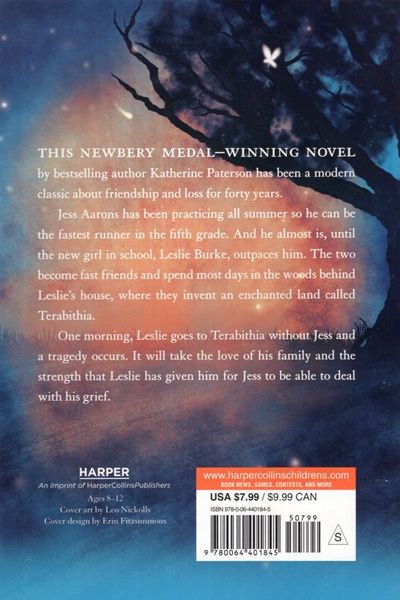 Description : The 40th anniversary edition of the classic Newbery Medal-winning title by beloved author Katherine Paterson, with brand-new bonus materials including an author™snote by Katherine herself and a foreword by New York Times bestselling author Kate DiCamillo. Jess Aarons has been practicing all summer so he can be the fastest runner in the fifth grade. And he almost is, until the new girl in school, Leslie Burke, outpaces him. The two become fast friends and spend most days in the woods behind Leslie’s house, where they invent an enchanted land called Terabithia. One morning, Leslie goes to Terabithia without Jess and a tragedy occurs. It will take the love of his family and the strength that Leslie has given him for Jess to be able to deal with his grief. Bridge to Terabithia was also named an ALA Notable Children’s Book and has become a touchstone of children’s literature, as have many of Katherine Paterson’s other novels, including The Great Gilly Hopkins and Jacob Have I Loved.