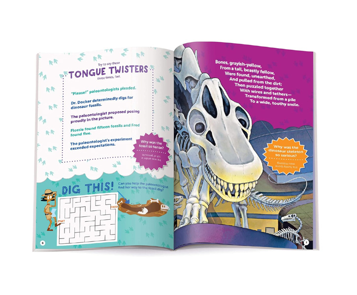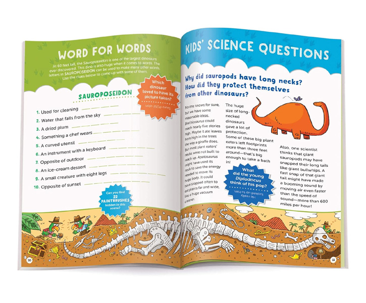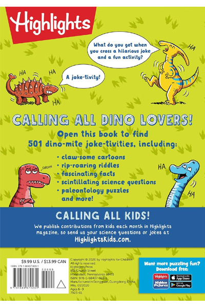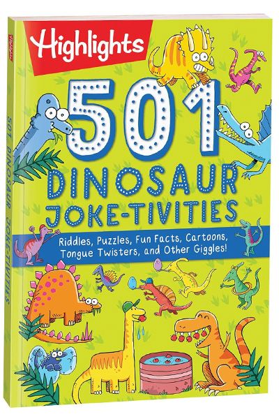 Description : Kids are enthralled by prehistoric creatures, so we packed as much as we could into this book, starting with a pronunciation guide for 101 types of dinosaurs from Acrocanthosaurus to Zuul. After that, dino enthusiasts can read fascinating facts like how big a newly hatched T-Rex might have been (about the size of a cat!), giggle at goofy jokes and tackle dino-mite puzzles. Not to mention the tons of dinosaur-themed hidden pictures scenes, limericks, cartoons, mazes, word finds, matching games, writing and drawing prompts, quizzes and other activities. Great as a gift for dino lovers or for screen-free entertainment any time, this collection helps kids build important skills all while having fun. Telling jokes is a great way for kids to develop creative expression and social-emotional skills, while puzzling improves focus, visual perception and more skills kids use in school. Like all Highlights products, 501 Dinosaur Joke-tivities is well researched, well-constructed and visually appealing, to bring kids age-centric fun with a purpose.