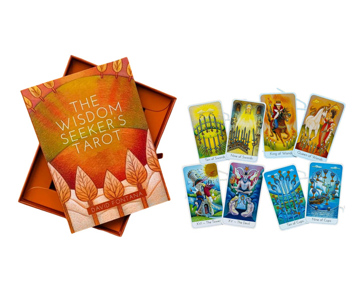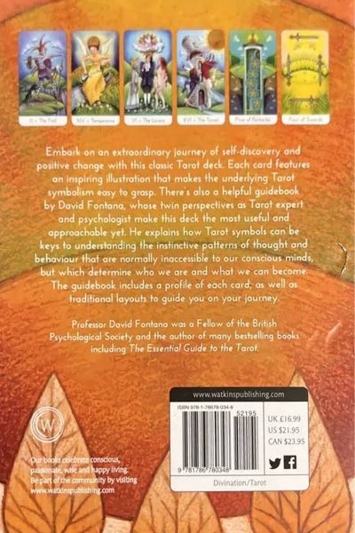Description : Embark on an extraordinary journey of self-discovery and positive change with this classic Tarot deck. Each card features an inspiring illustration that makes the underlying Tarot symbolism easy to grasp. There™salso a helpful guidebook by David Fontana, whose twin perspectives as Tarot expert and psychologist make this deck the most useful and approachable yet. He explains how Tarot symbols can be keys to understanding the instinctive patterns of thought and behaviour that are normally inaccessible to our conscious minds, but which determine who we are and what we can become. The guidebook includes a profile of each card, as well as traditional layouts to guide you on your journey.