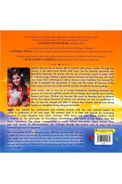 Description : Barkha Sharma has a unique gift to connect with young readers through her writing. In her debut book Global Little Yogis, she has playfully described and beautifully illustrated 30 asanas with the aim of igniting a spark in every child to embrace yoga. Striking a great balance between fun and learning, this book also draws from mythology as well as classical music traditions from around the world. It highlights the importance of yoga and the values of harmony of the mind, body and soul, the inside and the outside, the self and its surroundings. Each asana, with its own set of unique meditations, breathing exercises and prayers, has been thoughtfully paired with knowledge about specific spirit animals, flowers and trees. Children can become little yogis by learning how to balance all the five tattvas (elements of nature) and attaining not only an equilibrium in life, but also the strength and skills to achieve their dreams and become strong leaders in a brighter, loving and peaceful world. Barkha has imbued her professional and creative pursuits with her own spiritual beliefs to create a confluence of art and yoga. The primary goal is to help kids flourish by inculcating a sense of yogic discipline and artistic creativity, while being one with nature. Barkha’s book is inspired by the philosophy of ‘Vasudhaiva Kutumbakam’ (the world is one family) from the Maha Upanishad. The adage conceptualizes a world without boundaries where beauty, love, light and secrets of selfactualization are unlocked through the ancient tool of yoga and a balanced approach to happiness. This is a timeless book for people across different countries and cultures. It offers a unique opportunity for parents to bond with their beloved kids over yoga and help impart a strong value system to future generations. Barkha aims to equip parents and children to live harmoniously and with self-reliance and resilience. Discover the divine grace and learn how to imbibe inner strength.