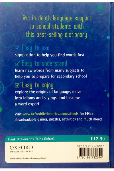 Description : This important new edition of the bestselling Oxford School Dictionary has been fully updated to include contemporary, relevant and comprehensive vocabulary. New words about technology, climate change and the Covid-19 pandemic have been added, for example eSports, vlog, net-zero, eco-friendly, coronavirus and social distancing. Definitions of familiar words, such as bubble, viral, cookie and platform, have been updated to reflect how they are used now. Complete with example sentences, fascinating word origins, and grammar and punctuation panels, this dictionary supports today™sstudents with their language and spelling skills, and helps with the transition from primary to secondary.