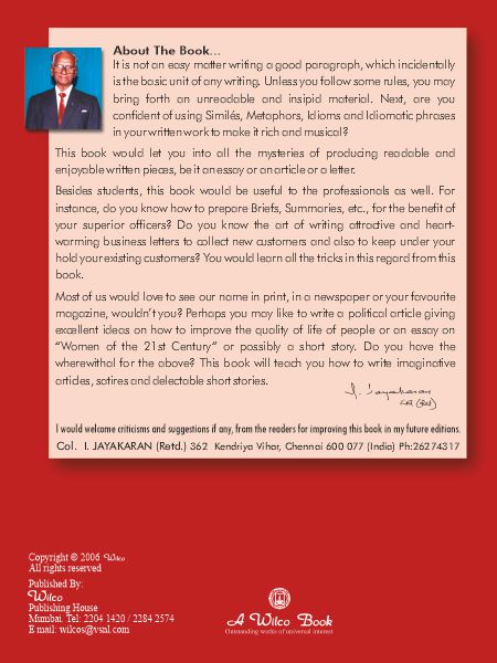Description : It is not an easy matter writing a good paragraph, which incidentally is the basic unit of any writing. Unless you follow some rules, you may bring forth an unreadable and insipid material. Next, are you confident of using Similés,Metaphors, Idioms and Idiomatic phrases in your written work to make it rich and musical? This book would let you into all the mysteries of producing readable and enjoyable written pieces, be it an essay or an article or a letter. Besides students, this book would be useful to the professionals as well. For instance, do you know how to prepare Briefs, Summaries, etc., for the benefit of our superior officers? Do you know the art of writing attractive and heart warming business letters to collect new customers and also to keep under your hold your existing customers? You would learn all the tricks in this regard from this book. Most of us would love to see our name in print, in a newspaper or your favourite magazine, wouldn't you? Perhaps you may like to write a political article giving excellent ideas on how to improve the quality of life of people or an essay on Women of the 21st Century or possibly a short story. Do you have the wherewithal for the above? This book will teach you how to write imaginative articles, satires and delectable short stories.