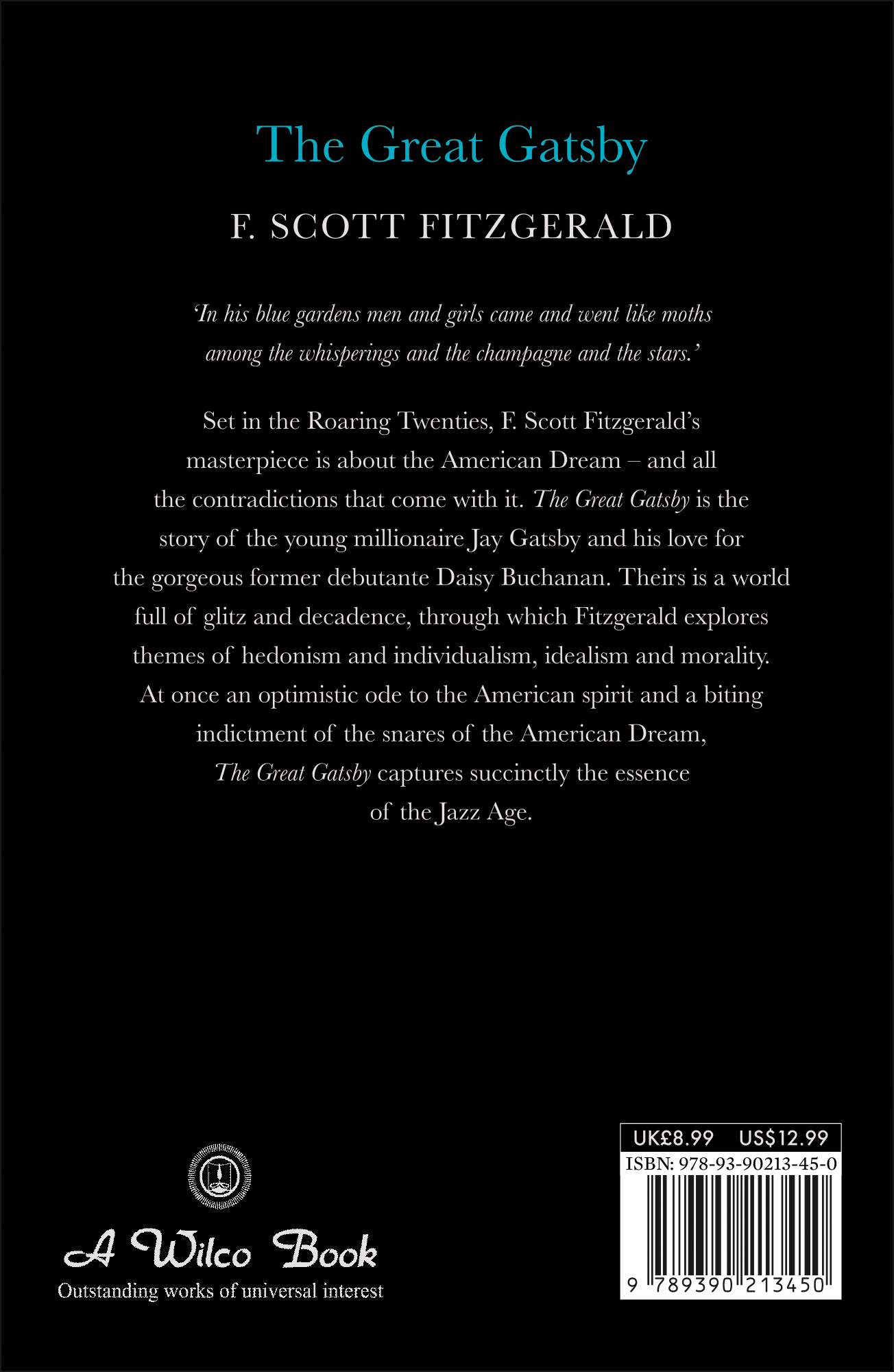 Description : ‘In his blue gardens men and girls came and went like moths among the whisperings and the champagne and the stars.’ Set in the roaring Twenties, F. Scott Fitzgerald’s masterpiece is about the American Dream – and all the contradictions that come with it. The Great Gatsby is the story of the young millionaire Jay Gatsby and his love for the gorgeous former debutante Daisy Buchanan. Theirs is a world full of glitz and decadence, through which Fitzgerald explores themes of hedonism and individualism, idealism and morality. At once an optimistic ode to the American spirit and a biting indictment of the snares of the American Dream, The Great Gatsby captures succinctly the essence of the Jazz Age.