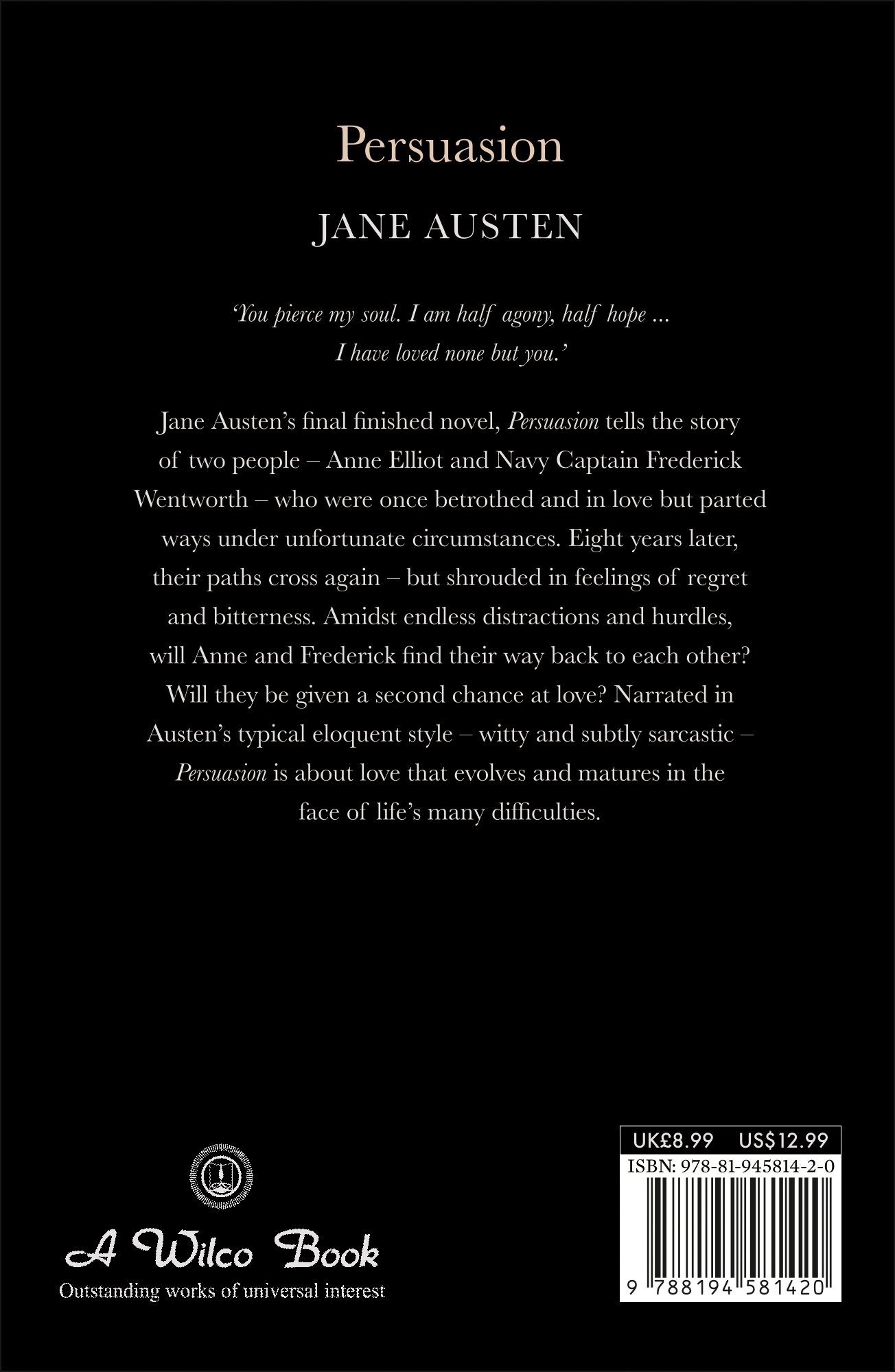 Description : ‘You pierce my soul. I am half agony, half hope ... I have loved none but you.’ Jane Austen’s final finished novel, Persuasion tells the story of two people – Anne Elliot and Navy Captain Frederick Wentworth – who were once betrothed and in love but parted ways under unfortunate circumstances. Eight years later, their paths cross again – but shrouded in feelings of regret and bitterness. Amidst endless distractions and hurdles, will Anne and Frederick find their way back to each other? Will they be given a second chance at love? Narrated in Austen’s typical eloquent style – witty and subtly sarcastic – Persuasion is about love that evolves and matures in the face of life’s many difficulties.
