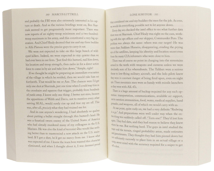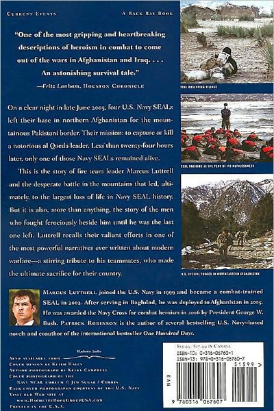 Description : On a clear night in late June 2005, four U.S. Navy SEAL™sleft their base in northern Afghanistan for the mountainous Pakistani border. Their mission was to capture or kill a notorious Al Qaeda leader known to be ensconced in a Taliban stronghold surrounded by a small but heavily armed force. Less then twenty-four hours later, only one of those Navy SEAL™sremained alive. This is the story of fire team leader Marcus Luttrell, the sole survivor of Operation Redwing, and the desperate battle in the mountains that led, ultimately, to the largest loss of life in Navy SEAL history. But it is also, more than anything, the story of his teammates, who fought ferociously beside him until he was the last one left-blasted unconscious by a rocket grenade, blown over a cliff, but still armed and still breathing. Over the next four days, badly injured and presumed dead, Luttrell fought off six al Qaeda assassins who were sent to finish him, then crawled for seven miles through the mountains before he was taken in by a Pashtun tribe, who risked everything to protect him from the encircling Taliban killers. A six-foot-five-inch Texan, Leading Petty Officer Luttrell takes us, blow by blow, through the brutal training of America™swarrior elite and the relentless rites of passage required by the Navy SEALs. He transports us to a monstrous battle fought in the desolate peaks of Afghanistan, where the beleaguered American team plummeted headlong a thousand feet down a mountain as they fought back through flying shale and rocks. In this rich, moving chronicle of courage, honor, and patriotism, Marcus Luttrell delivers one of the most powerful narratives ever written about modern warfare -- and a tribute to his teammates, who made the ultimate sacrifice for their country.