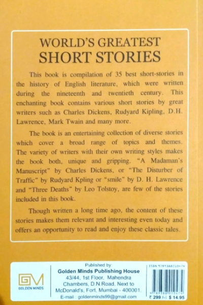 Description : This book is a compilation of 35 best short-stories in the history of English literature, which were written during the nineteenth and twentieth century. This enchanting book contains various short stories by great writers such as Charles Dickens, Rudyard Kipling, D. H. Lawrence, Mark Twain and many more. The book is an entertaining collection of diverse stories which cover a broad range of topics and themes. The variety of writers with their own writing styles makes the book both, unique and gripping. A Madaman™sManuscripts by Charles Dickens, or The Disturber of Traffic by Rudyard Kipling or Smile by D.H. Lawrence and Three Deaths by Leo Tolstoy, are few of the stories included in this book. Though written a long time ago, the content of these stories makes them relevant and interesting even today and offers an opportunity to read and enjoy these classic tales.