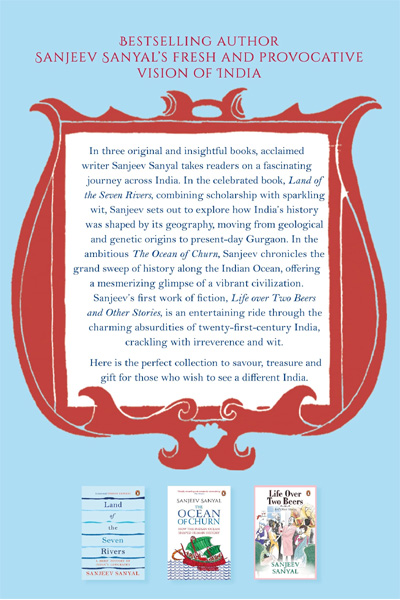 Description : Bestselling author Sanjeev Sanyal™sfresh and provocative vision of India! In three original and insightful books, acclaimed writer Sanjeev Sanyal takes readers on a journey through India™sfascinating prehistory, its glorious ancient lineage and its quirky contemporary times. In the celebrated book, 'Land of the Seven Rivers', combining scholarship with sparkling wit, Sanjeev sets out to explore how India™shistory was shaped by its geography, moving from geological and genetic origins to present-day Gurgaon. In the ambitious 'The Ocean of Churn', Sanjeev chronicles the grand sweep of history along the Indian Ocean, from East Africa to Australia, offering a mesmerizing glimpse into the heart of a vibrant civilization. Sanjeev™sfirst work of fiction, 'Life over Two Beers and Other Stories', is an entertaining ride through the charming absurdities of twenty-first-century India, crackling with irreverence and wit. Here is the perfect collection to savour, treasure and gift for those who wish to see a different India.