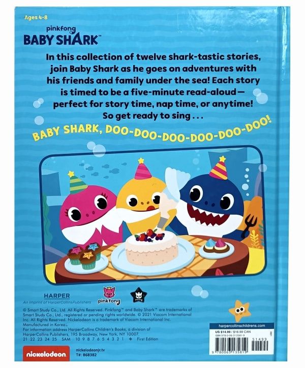 Description : This official Pinkfong collection includes twelve adorable stories, each perfectly timed to be read in five minutes! In this collection of twelve shark-tastic stories, join Baby Shark as he goes on adventures with his friends and family under the sea! With each story timed to be a five-minute read-aloud, this storybook makes anytime the perfect time to sing Baby Shark Doo-Doo-Doo-Doo-Doo-Doo! This official title is fully endorsed by Pinkfong and is based on characters from the YouTube global phenomenon with over 7.4 billion views.
