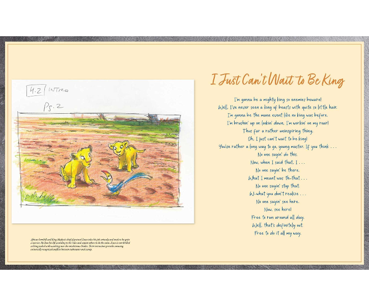 Description : Enjoy one of your favourite Disney animated classics in a new way: the full script, complete lyrics, an extensive collection of rare archival images, and insider stories on the development of The Lion King. Included in this volume are hundreds of behind-the-scenes facts about the production, animation, and historical and cultural frameworks of the film, along with stories from the film’s producer Don Hahn and co-directors Rob Minkoff and Roger Allers. All these engrossing facts and details are brought to life with rarely seen photographs, original sketches, and historical images curated from the Walt Disney Archives and Walt Disney Animation Research Library. Readers will enjoy an in-depth experience of this beloved Disney classic and gain a deeper appreciation for the animators, writers, musicians, and voice actors who brought the story to life.
